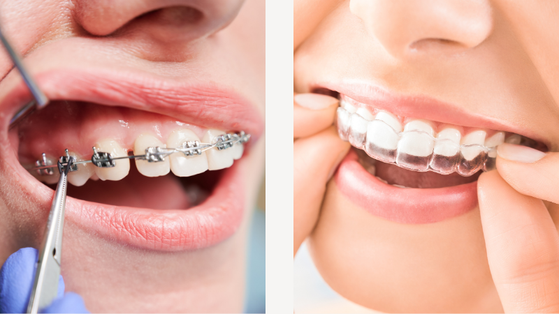 この写真の左側は金属がかなり目立っていますが、右側の透明なマウスピース矯正なら、口元をのぞき込まれない限り、目をこらしても分からないレベル。